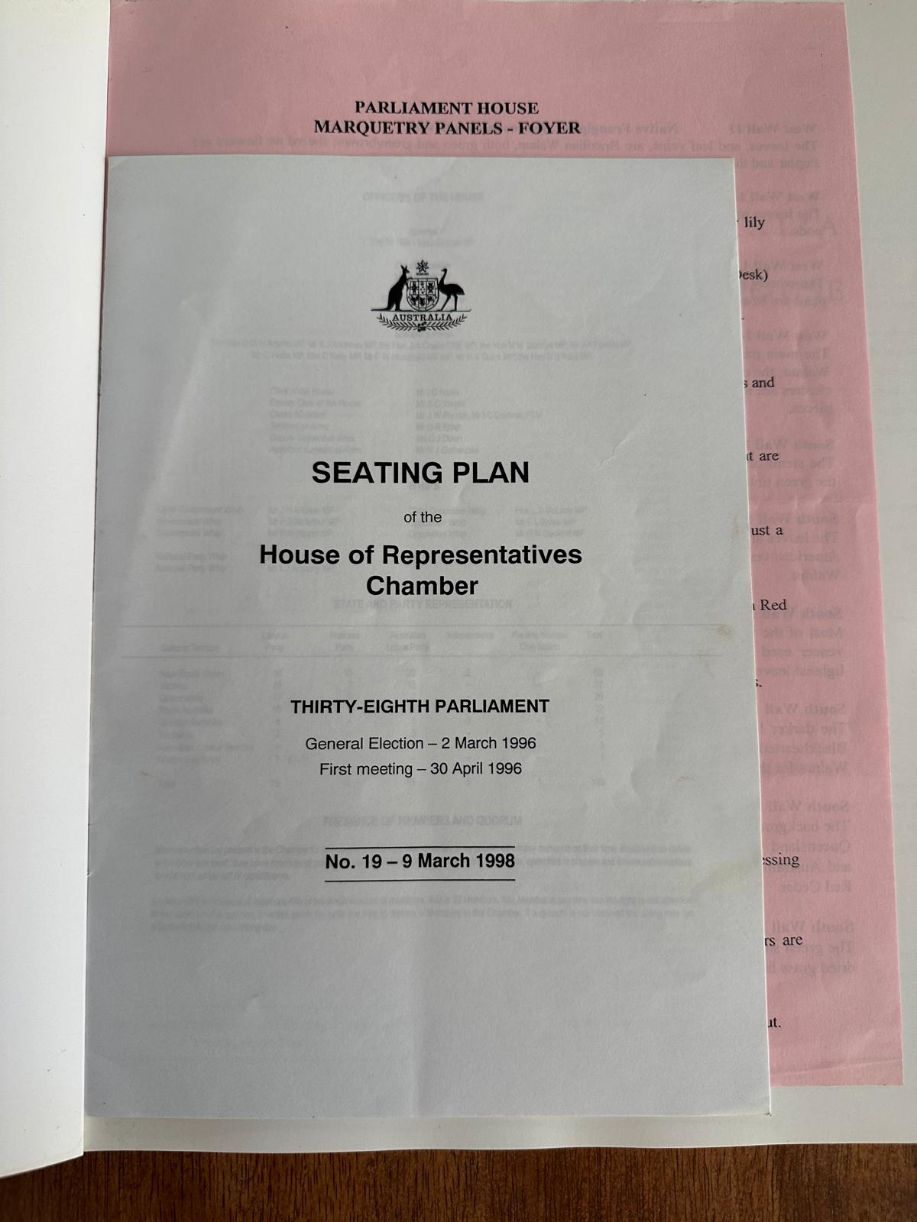 A richly illustrated volume showcasing the art collection housed within Australia’s Parliament House. Featuring works by prominent Australian artists, it reflects national identity and cultural expression. Includes Seating Plan for 9 March 1998 and Marquetry Panel booklet for the foyer.